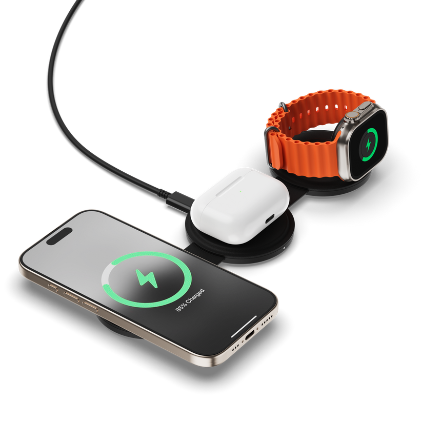 Το Satechi OntheGo 3-in-1 Wireless Charger είναι ένας premium, αναδιπλούμενος ασύρματος φορτιστής 3 σε 1, σχεδιασμένος για να φορτίζει ταυτόχρονα το iPhone, το Apple Watch και τα AirPods σας. Με υποστήριξη Qi2 και MagSafe, προσφέρει γρήγορη, ασφαλή και κομψή φόρτιση, ιδανική για το γραφείο ή το ταξίδι.